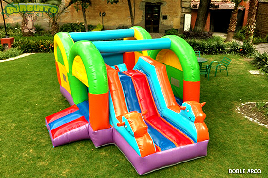 Este inflable de doble arco cuenta con una resbaladilla súper padre además de una estancia en forma de corral para la seguridad de los pequeños. En la parte lateral del inflable cuenta con un túnel especial para la diversión de tus peques.